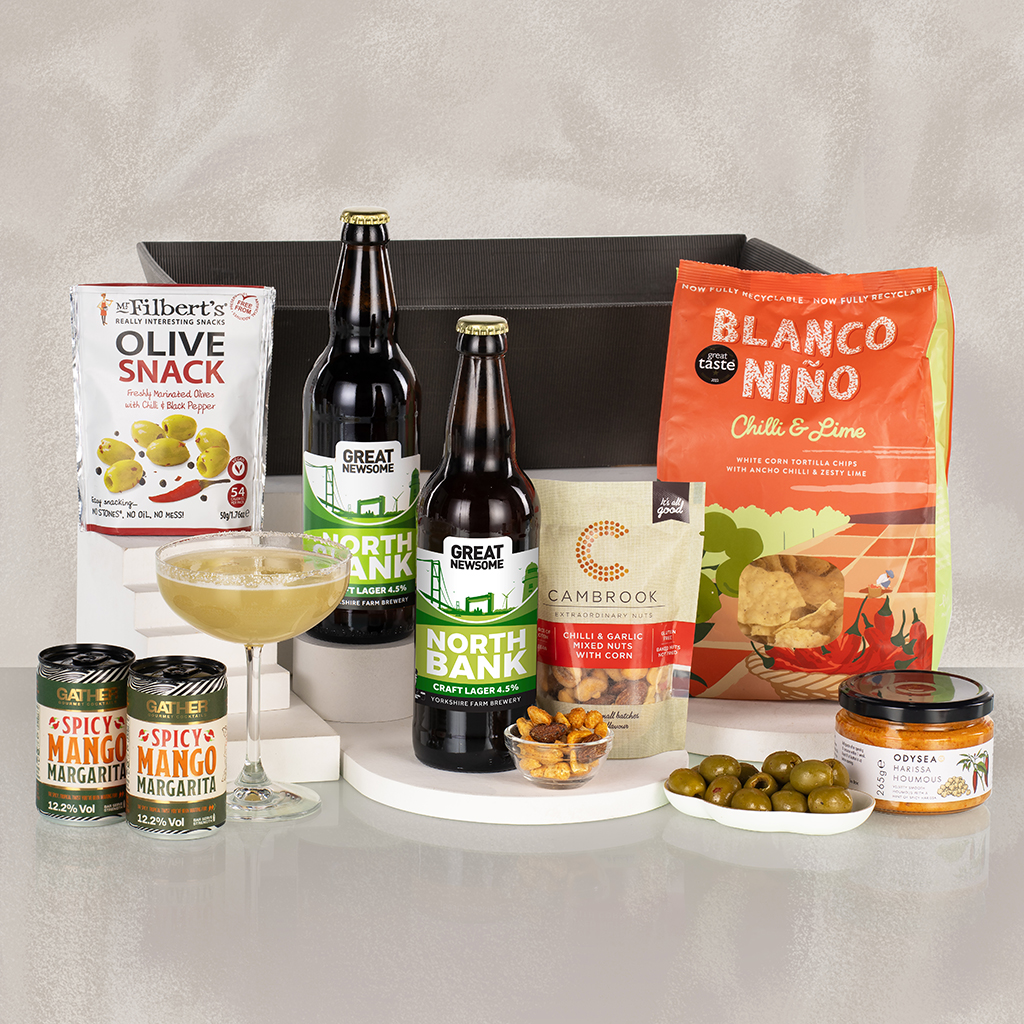 Turn up the heat with our A Little Bit of Spice gift — a bold and flavour-packed hamper that celebrates the joy of a little kick. Presented in a sleek black kraft tray, it’s brimming with fiery savoury treats and refreshing drinks, designed to impress anyone who loves their food full of character. Enjoy Cambrook Extraordinary Chilli & Garlic Mixed Nuts with Corn and Blanco Niño Chilli & Lime Tortilla Chips for irresistible crunch and warmth, perfectly paired with Odysea Harissa Houmous for a rich, smoky dip. Mr Filbert’s Chilli & Black Pepper Olive Snack adds Mediterranean flair, while the drinks bring a cooling contrast — Great Newsome North Bank Lager for crisp refreshment and Gather Spicy Mango Margarita for a tangy twist. Vibrant, daring and delicious, A Little Bit of Spice makes an unforgettable gift for foodies, party hosts or anyone who enjoys a touch of heat in their hamper.