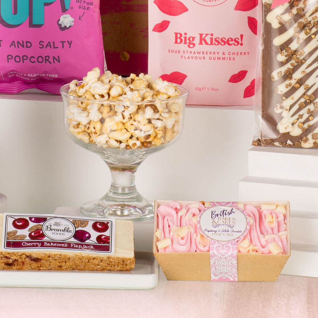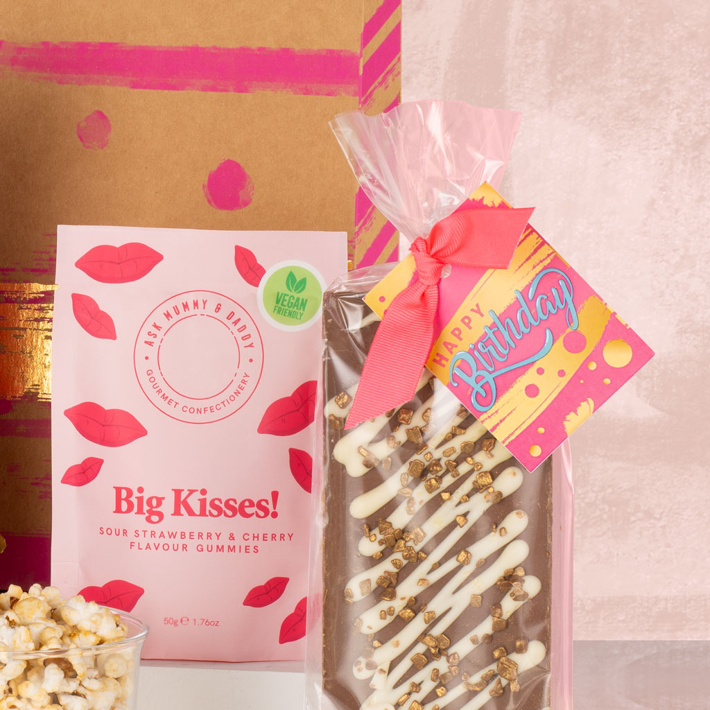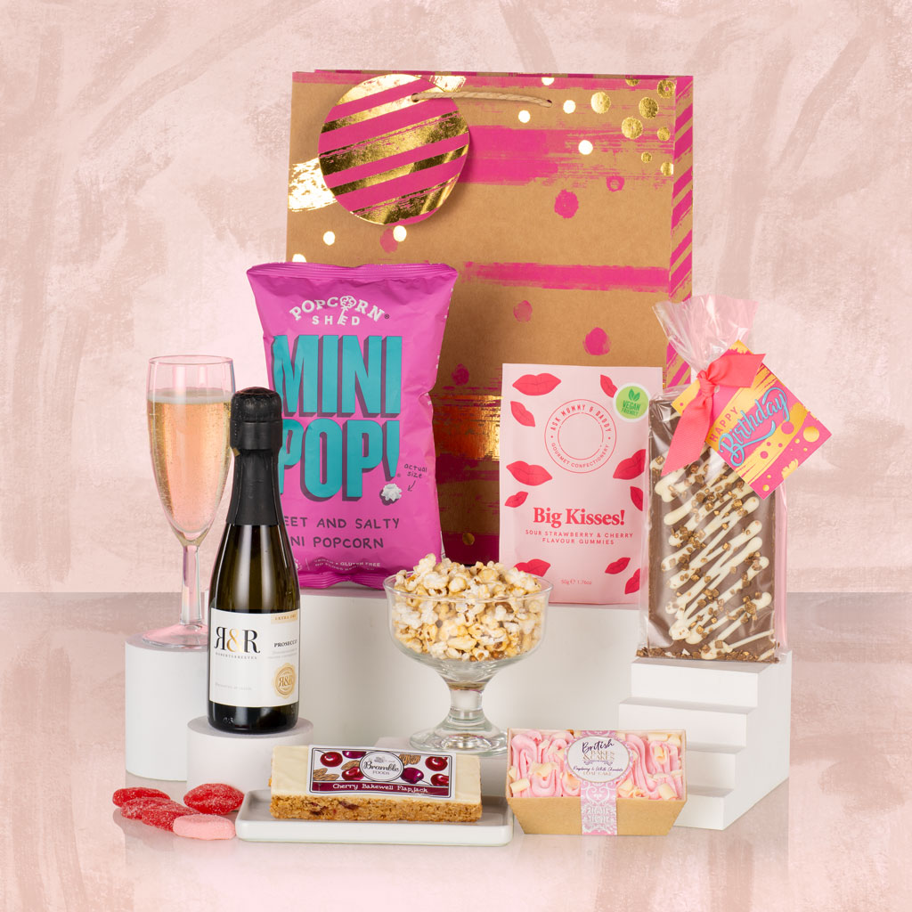 Make their special day sparkle with Birthday Bliss — a joyful little gift brimming with sweetness, celebration, and charm. Whether it’s sent to a colleague, friend, or loved one, this delightful collection turns an ordinary birthday into a moment worth savouring. Tucked inside a stylish gift bag, the treats are as thoughtful as they are tempting. A mini bottle of Robert & Reeves Prosecco adds an instant pop of celebration, while Popcorn Shed Mini Pop! Sweet and Salty Popcorn brings that satisfying crunch. The indulgence continues with a Stas Milk Chocolate Bar and a British Bakes & Cakes Raspberry & White Chocolate Mini Loaf Cake — a perfect pairing of rich cocoa and soft, fruity sponge. For a playful flourish, Ask Mummy & Daddy Big Kisses Sweets add a charming touch of fun, while a generous Bramble Foods Cherry Bakewell Flapjack captures that classic British bakehouse comfort. Every bite feels like a cheerful toast to good times and great company. Bright, beautifully balanced and ready to give, Birthday Bliss is a small but memorable gesture — the perfect way to say happy birthday with unmistakable Virginia Hayward style.