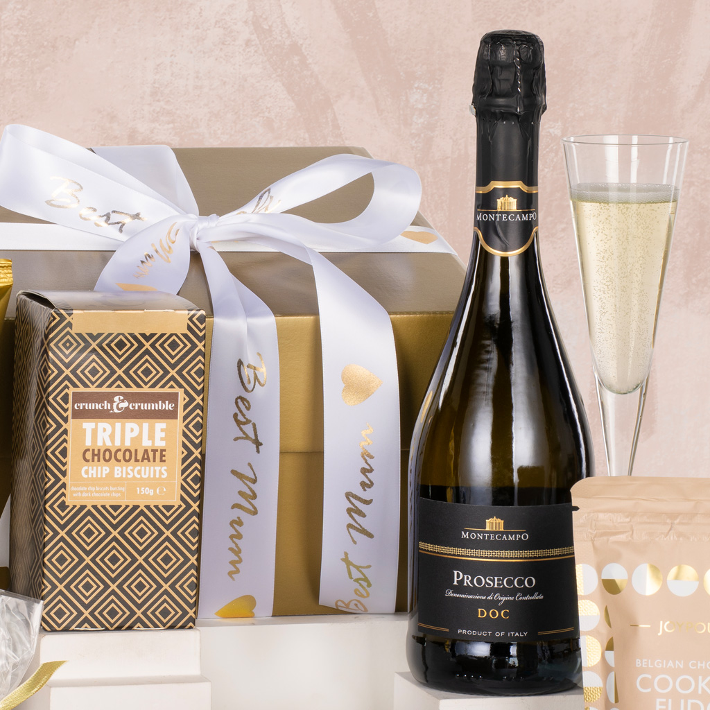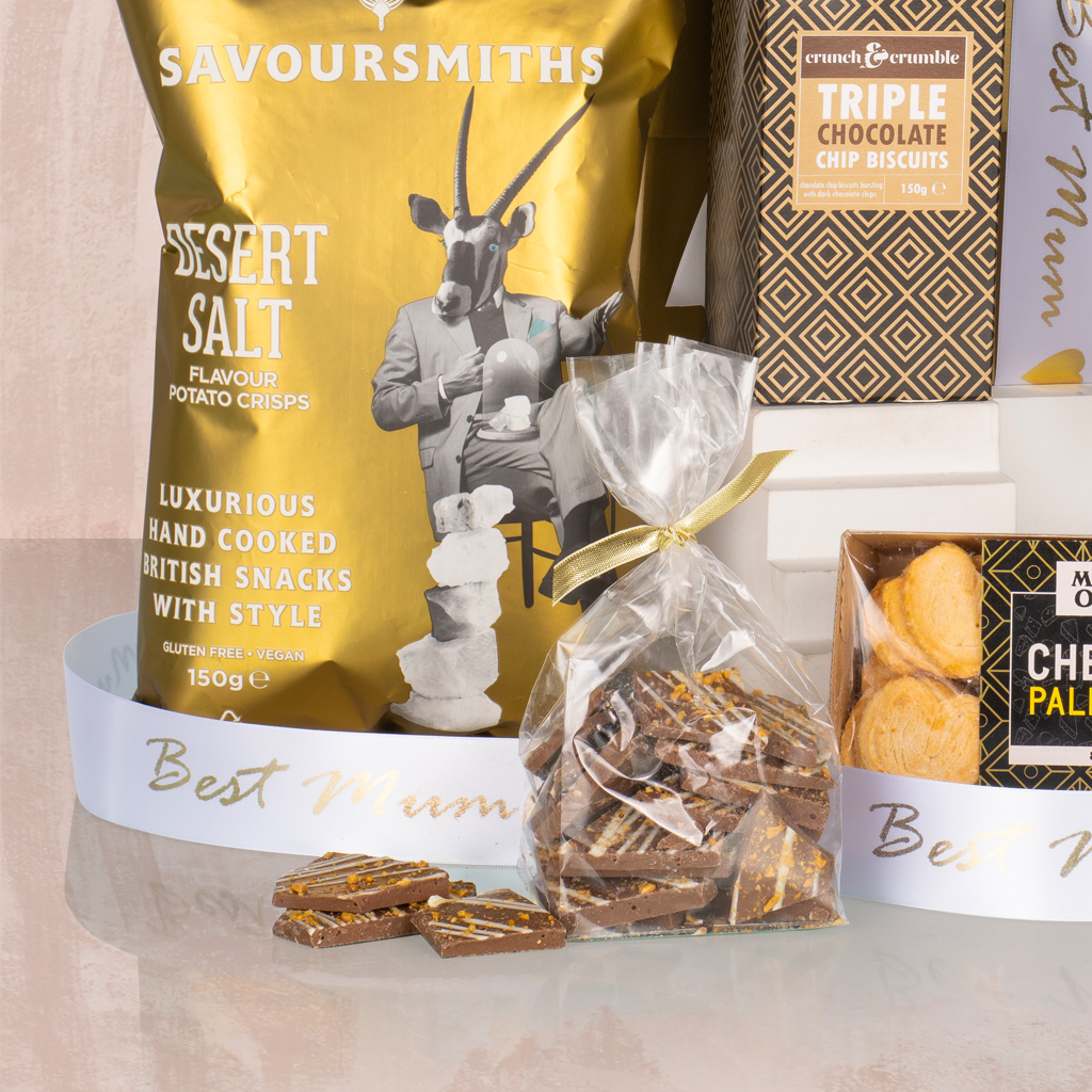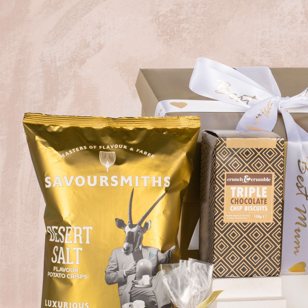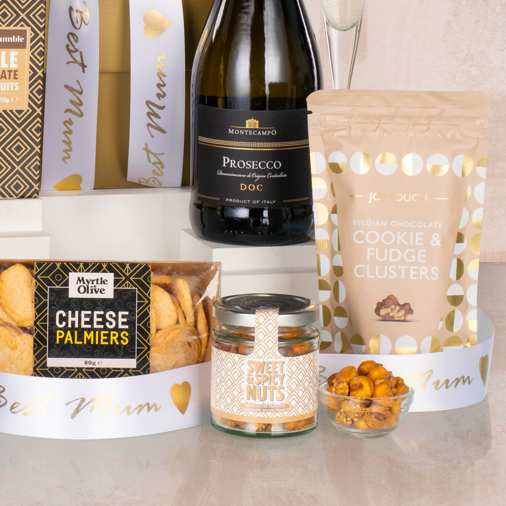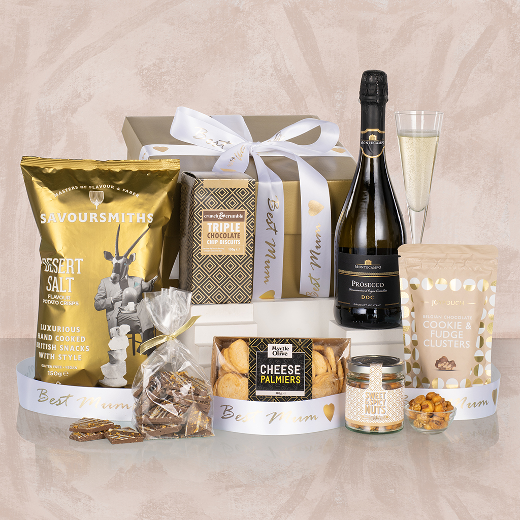 Inside, she’ll find a selection of indulgent treats to tempt every taste. Crunchy, chocolatey Crunch & Crumble Triple Chocolate Biscuits and rich Joypouch Cookie & Fudge Clusters satisfy the sweet tooth, while Stas Chocolatier Broken Milk Chocolate with Honeycomb adds a touch of luxurious decadence. Savoury favourites include Cambrook Sweet & Spicy Nut Mix, Myrtle & Olive Cheese Palmiers, and Savoursmiths Desert Salt Crisps, offering a perfect balance of flavour and crunch. To toast the occasion, a bottle of Montecampo Prosecco DOC completes this premium hamper with sparkling elegance.