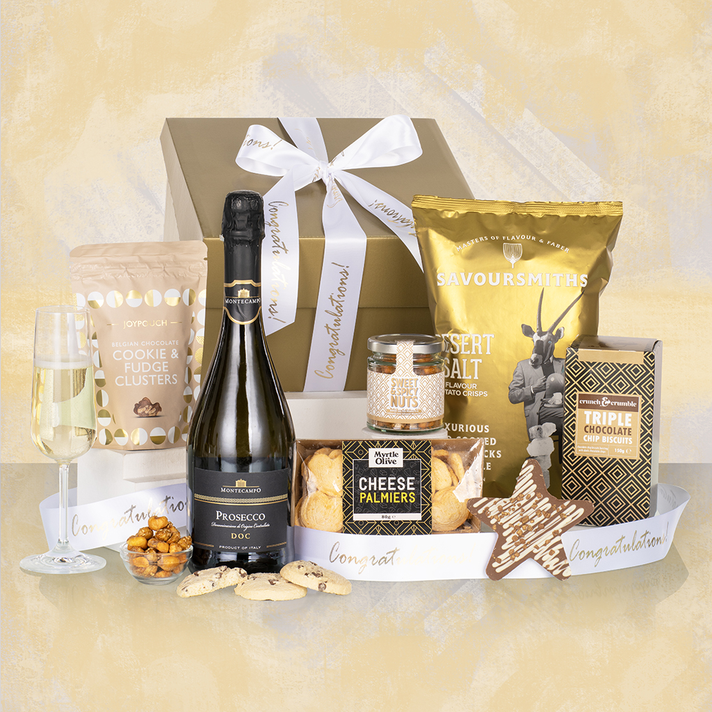 Inside, recipients will enjoy a delightful mix of indulgences. The rich and decadent Crunch & Crumble Triple Chocolate Biscuits and Joypouch Cookie & Fudge Clusters satisfy the sweet tooth, while the Stas Chocolatier Milk Chocolate Star with White Chocolate Drizzle & Gold Sprinkles adds a touch of festive elegance. Savoury treats such as Cambrook Sweet & Spicy Nut Mix, Myrtle & Olive Cheese Palmiers, and Savoursmiths Desert Salt Crisps provide a perfectly balanced variety of flavours and textures. To toast the celebration, a crisp and refreshing Montecampo Prosecco DOC completes the hamper, making it the ultimate gift to say “congratulations” and share a moment of luxury.