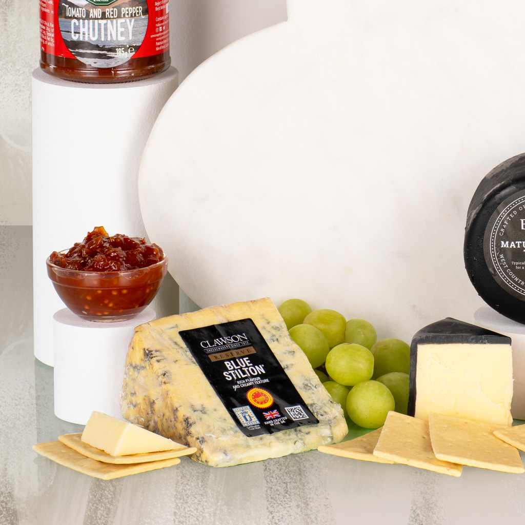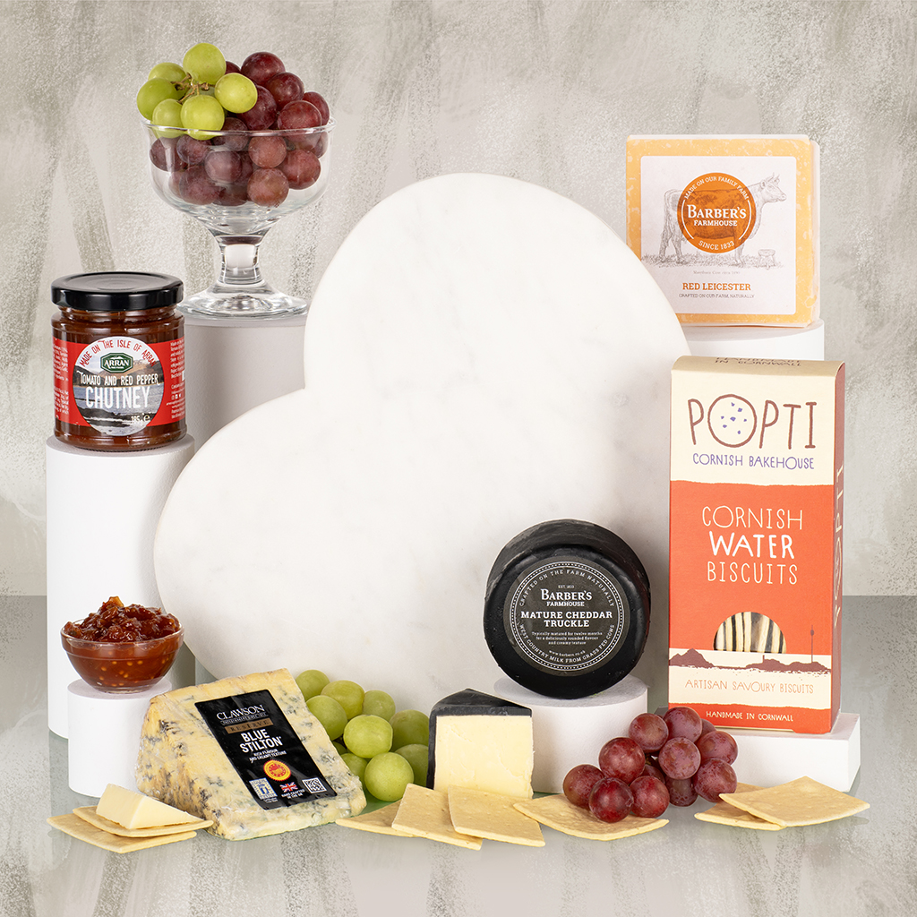 For those who can’t resist a good cheese board, our Cheesy Lover gift is a deliciously sophisticated selection that’s perfect for sharing. Brimming with artisan flavours and beautifully presented, it brings together classic British cheeses, savoury biscuits and a stylish marble serving board to complete the experience. Inside you’ll find the creamy depth of Barber’s Farmhouse Mature Cheddar Truckle and the mellow nuttiness of Barber’s Farmhouse Red Leicester, joined by a wedge of Long Clawson Blue Stilton — bold, rich and full of character. These are perfectly complemented by Popti Cornish Bakehouse Water Biscuits, made in Cornwall for the ultimate crunch, and Arran Fine Foods Tomato & Red Pepper Chutney, adding a sweet, tangy lift to every bite. Presented in a smart postal carton with a Large White Marble Heart Serving Board, this thoughtful gift is ready to serve and savour. Cheesy Lover is the ideal choice for birthdays, thank-yous or client gifting — a celebration of British cheesemaking at its finest.