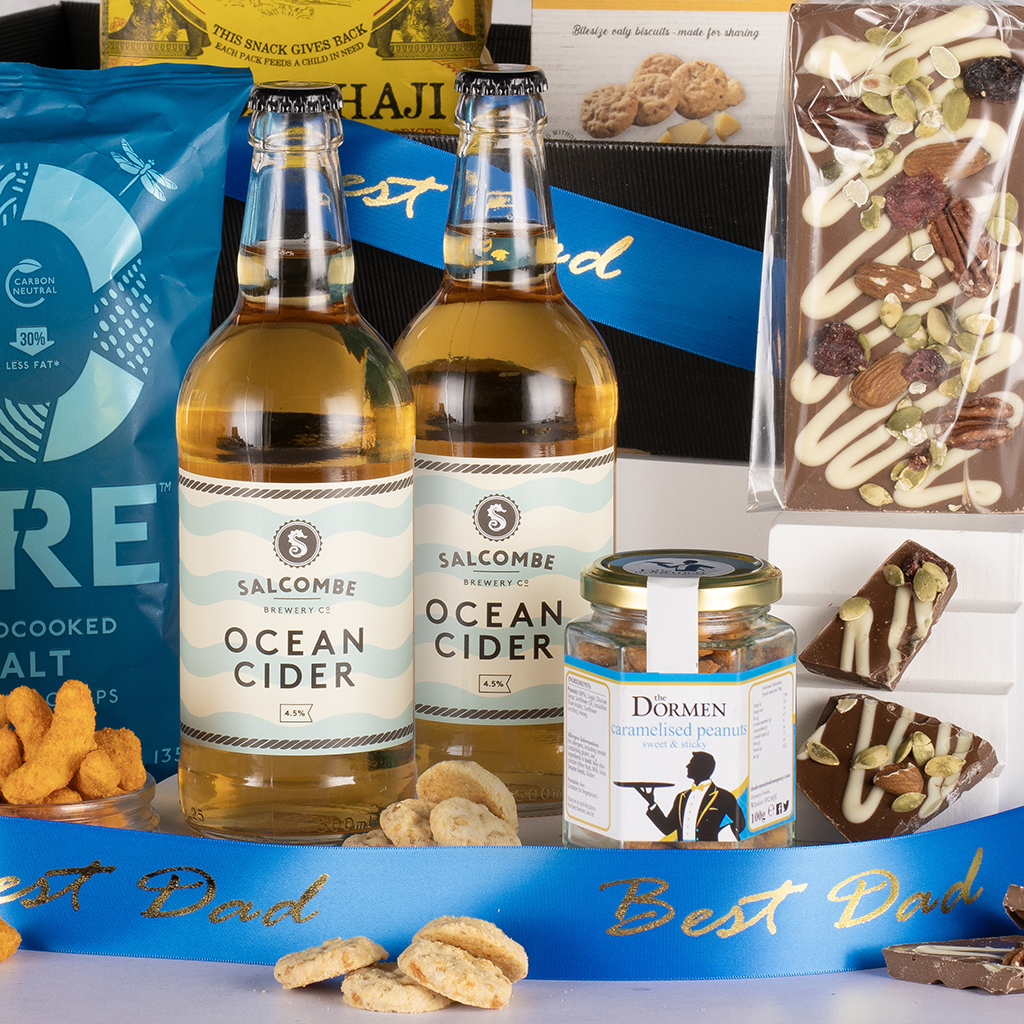 Celebrate Dad this Father’s Day with our luxurious Cider & Snacks Hamper! Presented in a stylish black gift tray and adorned with a blue satin ribbon featuring a gold ‘Best Dad’ message, this hamper is filled with a delightful mix of sweet and savoury indulgences. Treat him to the smooth richness of a Stas Milk Chocolate Bar, the savoury crunch of Grandma Wild’s Mini Bites, and the irresistible 10 Acre Sea Salt Hand Cooked Crisps, all perfectly complemented by a refreshing bottle of Salcombe Brewery Ocean Cider. Make this Father’s Day unforgettable—order now and show Dad how much he means to you!