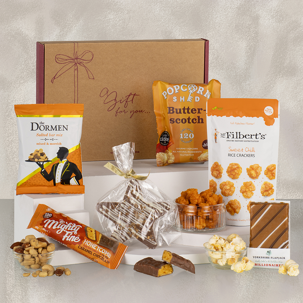 Small in size but big on flavour, our Delectable Delights Letterbox gift proves that a little indulgence goes a long way. Thoughtfully curated and perfectly portioned, it’s designed to slip neatly through the letterbox — a delicious surprise for any occasion. Inside, savour The Dormen Salted Bar Mix and Mr Filbert’s Sweet Chilli Rice Crackers for a satisfying savoury crunch, balanced beautifully by Mighty Fine Salted Caramel Honeycomb Bar and Popcorn Shed Butterscotch Snack Pack for a touch of sweetness. Yorkshire Flapjack Billionaires Slice adds rich caramel indulgence, while a Stas Chocolatier Milk Chocolate Star completes the selection with a little sparkle. Ideal for birthdays, thank-yous or thoughtful surprises sent by post, Delectable Delights Letterbox is a compact collection with true Virginia Hayward charm — perfectly balanced, beautifully presented and endlessly enjoyable.