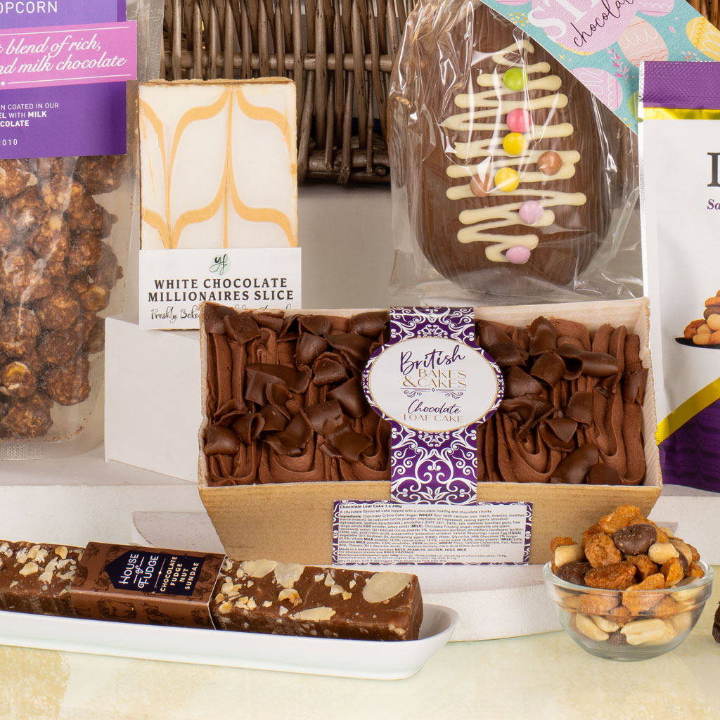 At its centre sits a show-stopping Stas Chocolatier Easter Egg, handmade from silky milk chocolate and perfect for cracking open on Easter morning. Surrounding it are layers of tempting delights: the rich British Bakes & Cakes Chocolate Loaf Cake, buttery Farmhouse Biscuits Chocolate Brownie Biscuits, and a golden Yorkshire Flapjack White Chocolate Millionaire Slice for a touch of decadence. The Stas Milk Chocolate Bar with White Chocolate Drizzle and Gold Sprinkles gleams like sunshine through spring leaves, while the House of Fudge Chocolate Fudge Nut Sundae Fudge Log melts away with irresistible smoothness.