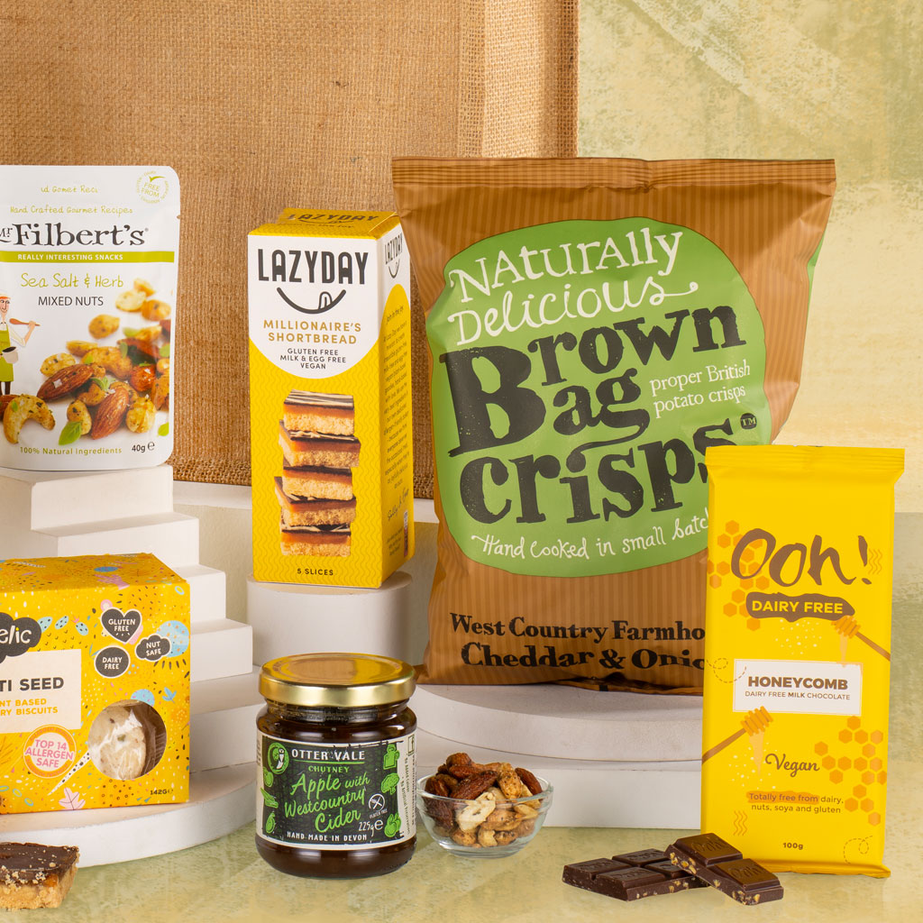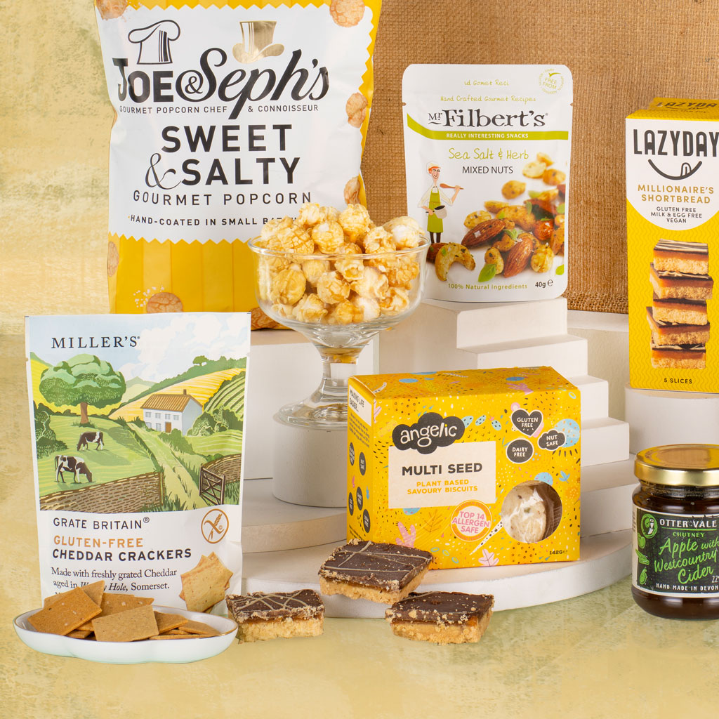 Full of flavour and free from compromise, our Gluten & Wheat Free Goodies hamper proves that great taste doesn’t need gluten. This generous collection brings together sweet and savoury treats from some of the UK’s most trusted artisan makers, beautifully packed in a smart postal carton for easy gifting. Enjoy the crunch of Angelic Multi Seed Savoury Biscuits and Brown Bag Cheddar & Onion Crisps, perfectly balanced by Mr Filbert’s Sea Salt & Herb Mixed Nuts and Otter Vale Apple with Westcountry Cider Chutney — ideal for pairing or grazing. Sweet satisfaction comes with Lazy Day Millionaire’s Shortbread and Joe & Seph’s Sweet & Salty Popcorn, while Ooh! Chocolata Dairy Free & Vegan Honeycomb Milk Chocolate adds a smooth and indulgent finish. Thoughtfully curated, inclusive and full of variety, this hamper is a celebration of mindful eating — a gift everyone can enjoy, whether they’re gluten-free by choice or necessity.
