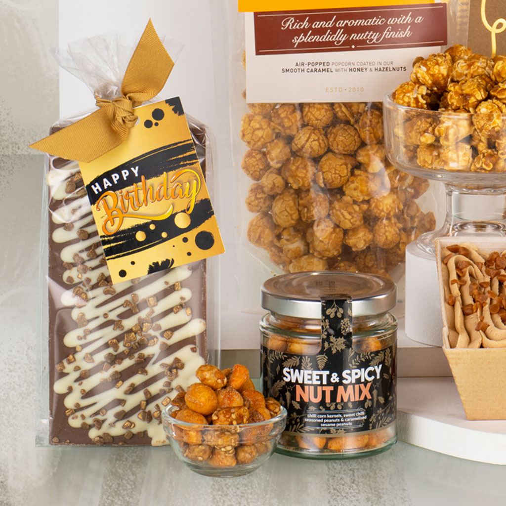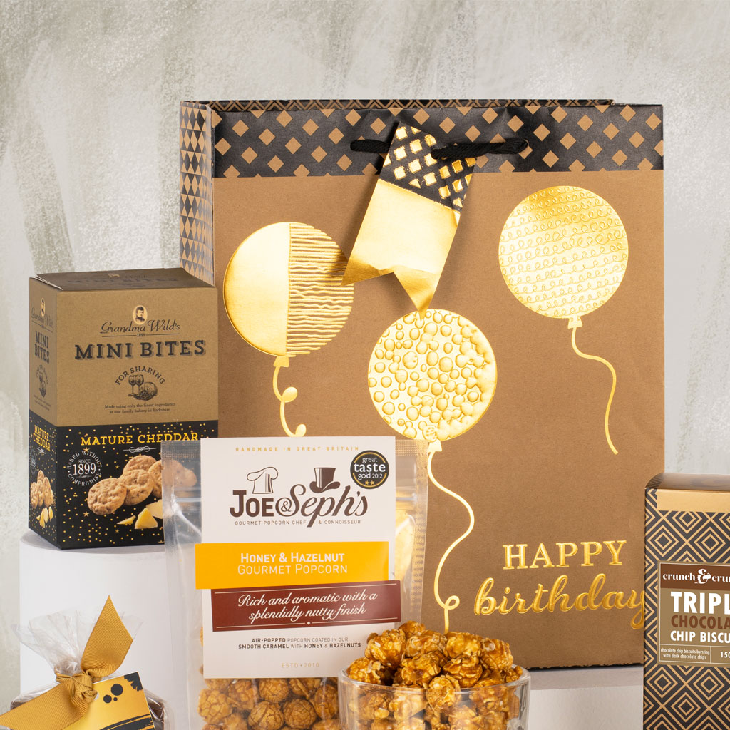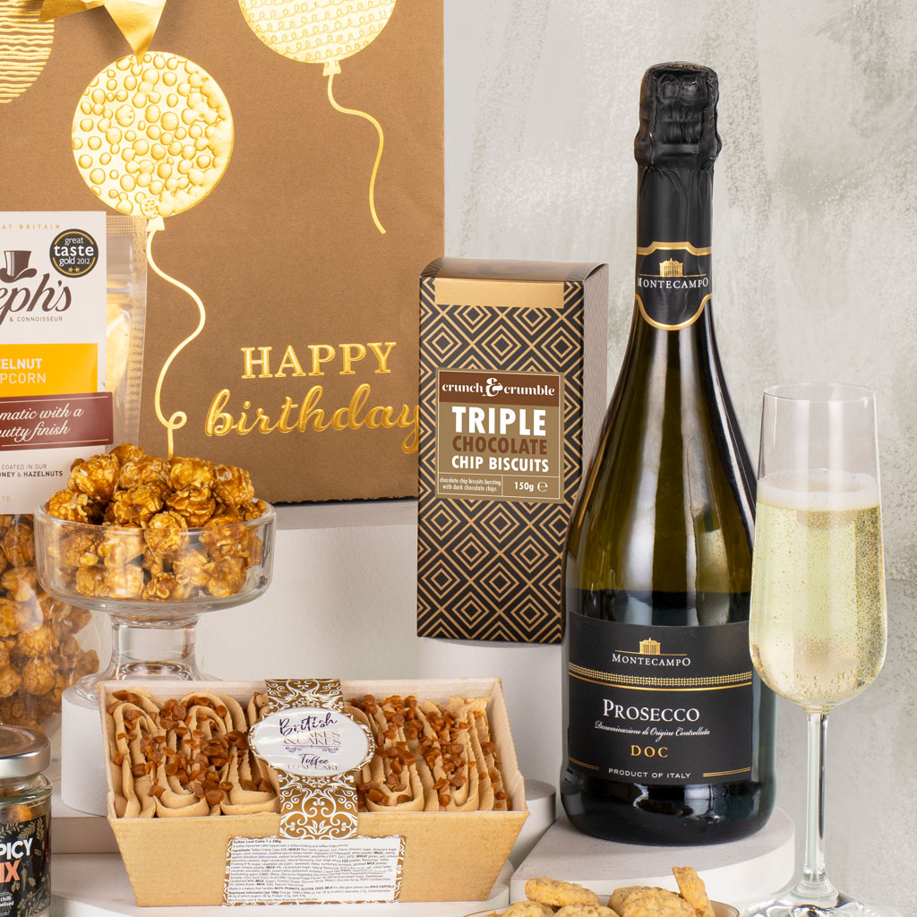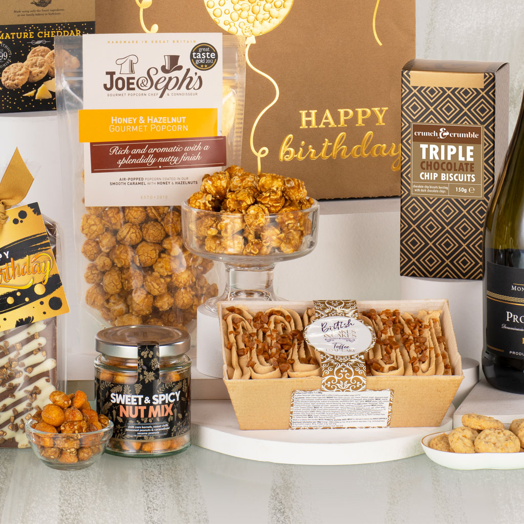 Make their special day sparkle with our Happy Birthday to You gift — a luxurious mix of sweet indulgence, savoury nibbles and a celebratory bottle of Prosecco, all beautifully hand-packed in a stylish gift bag. Thoughtfully curated in elegant black and gold, this birthday collection combines sophistication with irresistible flavour. Enjoy the warming crunch of Cambrook Sweet & Spicy Nut Mix and Grandma Wild’s Mature Cheddar Mini Bites, perfectly balanced by Crunch & Crumble Triple Chocolate Biscuits and a rich British Bakes & Cakes Toffee Loaf Cake. Joe & Seph’s Honey & Hazelnut Gourmet Popcorn adds a nutty caramel sweetness, while a Stas Milk Chocolate Bar with White Chocolate Drizzle and Gold Sprinkles, finished with a Happy Birthday tag, brings a golden flourish. To toast the occasion, a bottle of Montecampo Prosecco DOC adds sparkle to every moment. Elegant, joyful and ready to give, Happy Birthday to You captures celebration the Virginia Hayward way — refined, thoughtful and delicious.