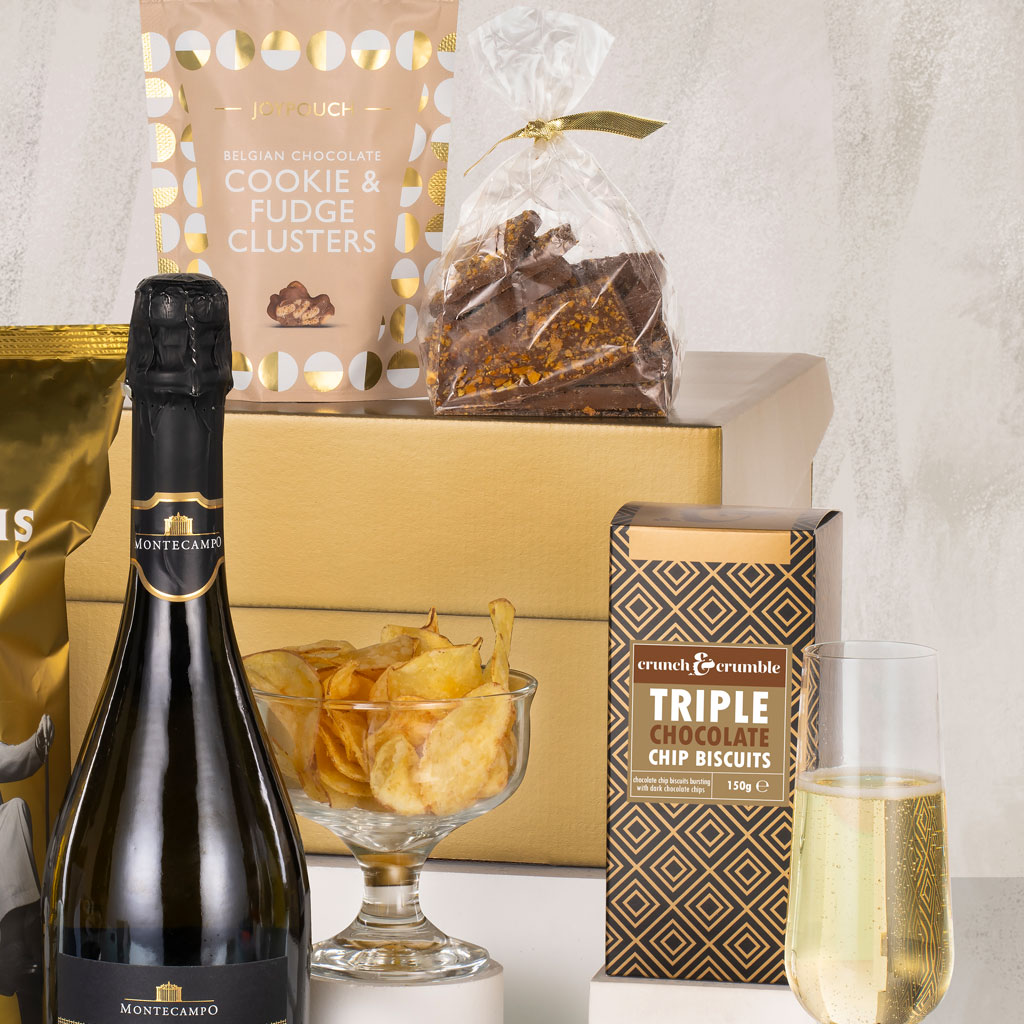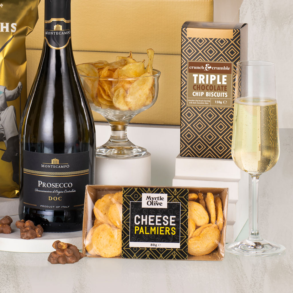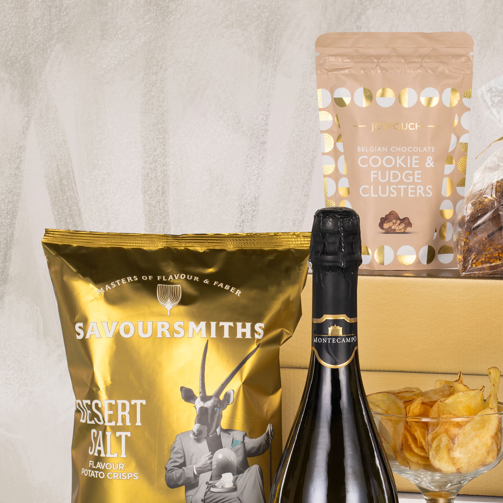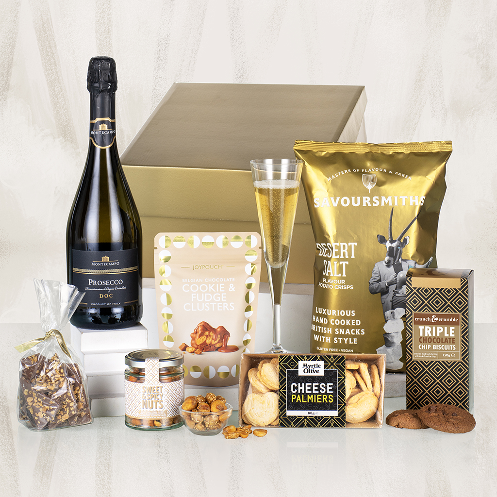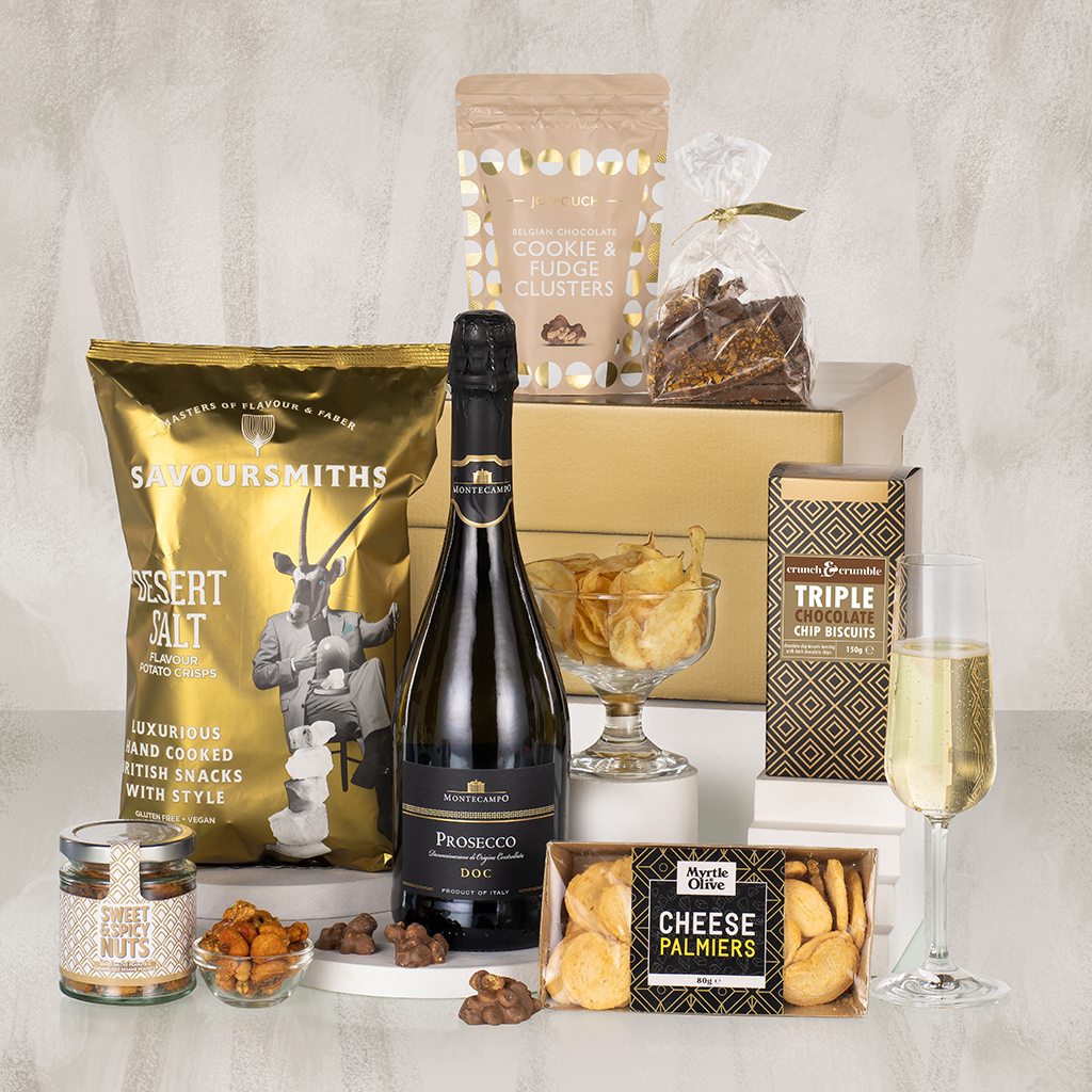 Raise a glass to life’s special moments with our Let’s Celebrate gift box — a golden collection of sweet and savoury delights perfectly paired with a bottle of Montecampo Prosecco DOC. Presented in a radiant gold gift box, this elegant selection captures the joy of celebration the Virginia Hayward way: stylish, indulgent and full of flavour. Savoury favourites set the tone with Cambrook Sweet & Spicy Nut Mix, Myrtle & Olive Cheese Palmiers and Savoursmiths Desert Salt Crisps — each crafted for irresistible crunch and balance. For those with a sweet tooth, Crunch & Crumble Triple Chocolate Biscuits and Joypouch Cookie & Fudge Clusters bring comforting richness, while Stas Chocolatier Broken Milk Chocolate with Honeycomb adds a luxurious finishing touch. To complete the experience, Montecampo Prosecco DOC delivers lively bubbles and crisp fruit notes, perfect for toasting every occasion. Beautifully presented and ready to give, Let’s Celebrate is a radiant expression of appreciation, joy and timeless good taste.