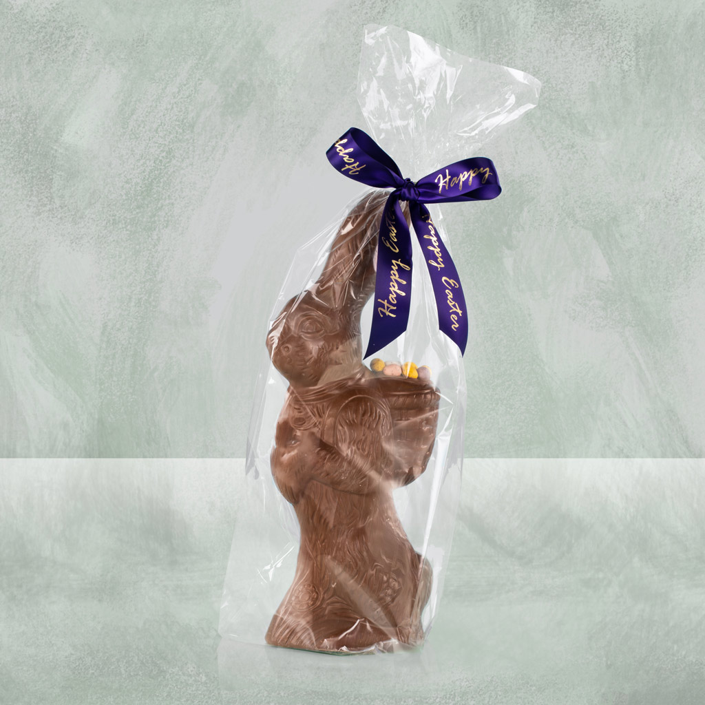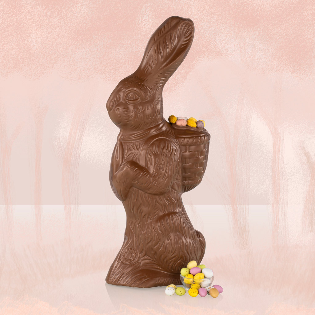 Hop into Easter with Mr Nibbs the Easter Bunny, a delightful 1kg handmade chocolate bunny holding a basket overflowing with mini-coloured eggs. This charming, indulgent creation is perfect as a luxury Easter gift, a show-stopping Easter egg alternative, or a thoughtful corporate gift to surprise clients and colleagues.