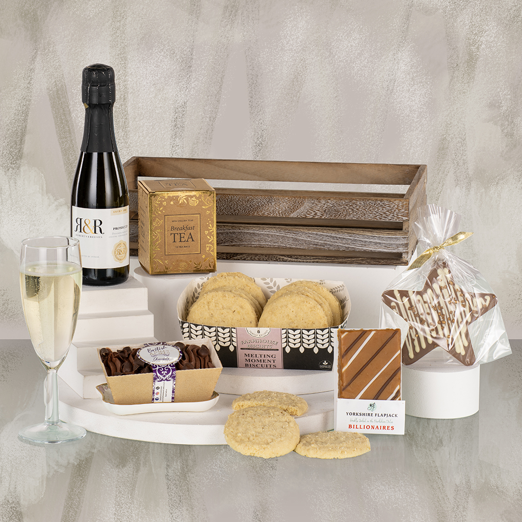 Inside, they’ll enjoy Farmhouse Biscuits Melting Moments, delicately buttery and melt-in-the-mouth, alongside a rich British Bakes & Cakes Chocolate Mini Loaf Cake that is perfect for sharing over a cup of tea. The indulgent Yorkshire Flapjack Billionaires Slice, layered with golden caramel and smooth chocolate, adds a decadent touch, while the Stas Chocolatier Milk Chocolate Star with White Chocolate Drizzle & Gold Sprinkles brings a luxurious, elegant flourish. For a comforting pause, the hamper includes New English Teas English Breakfast Tea, and for a celebratory toast, a bottle of R&R Robert & Reeves Prosecco completes the experience.