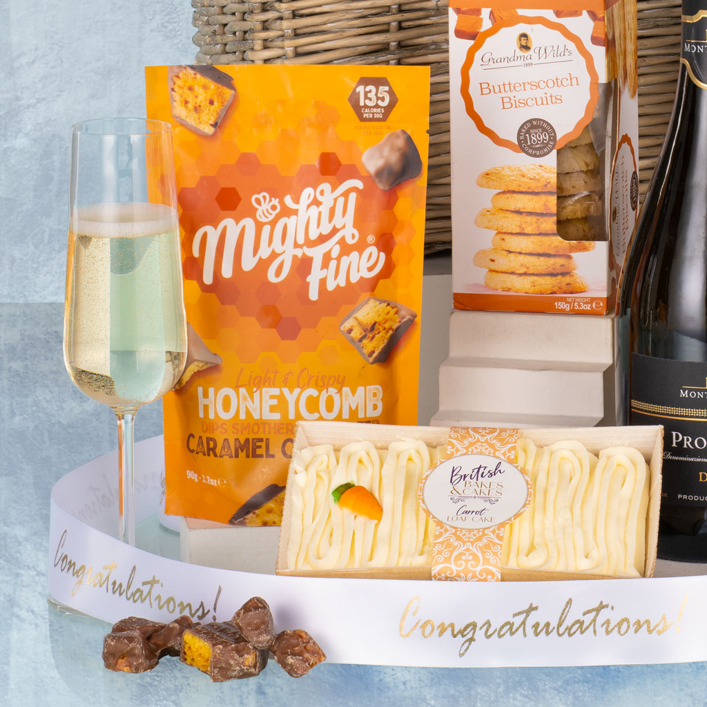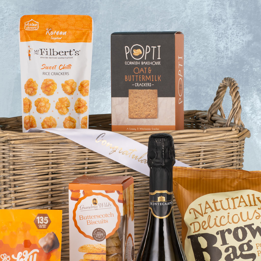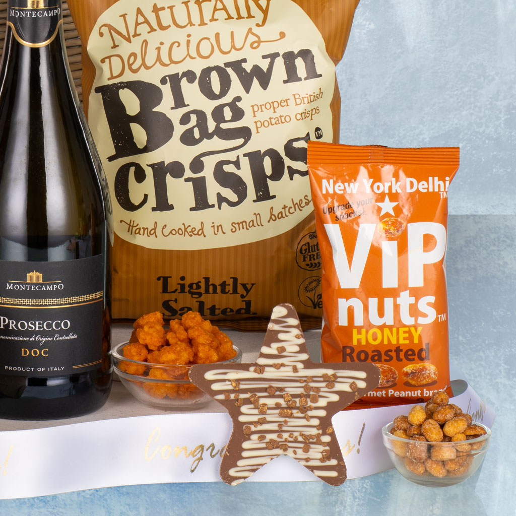 Inside, parents can enjoy a British Bakes & Cakes Carrot Loaf Cake, Grandma Wild’s Butterscotch Biscuits, and a decadent Stas Chocolatier Milk Chocolate Star with White Chocolate Drizzle & Gold Sprinkles, alongside sweet and crunchy Mighty Fine Salted Caramel Honeycomb Dips. Savoury snacks include Brown Bag Crisps Lightly Salted, Mr Filbert’s Sweet Chilli Rice Crackers, and Popti Cornish Bakehouse Oat & Buttermilk Crackers, with a nutty treat of New York Delhi ViP Nuts Honey Roasted Peanuts. To add a celebratory touch, the hamper also includes a bottle of Montecampo Prosecco, perfect for a quiet toast to the new arrival.