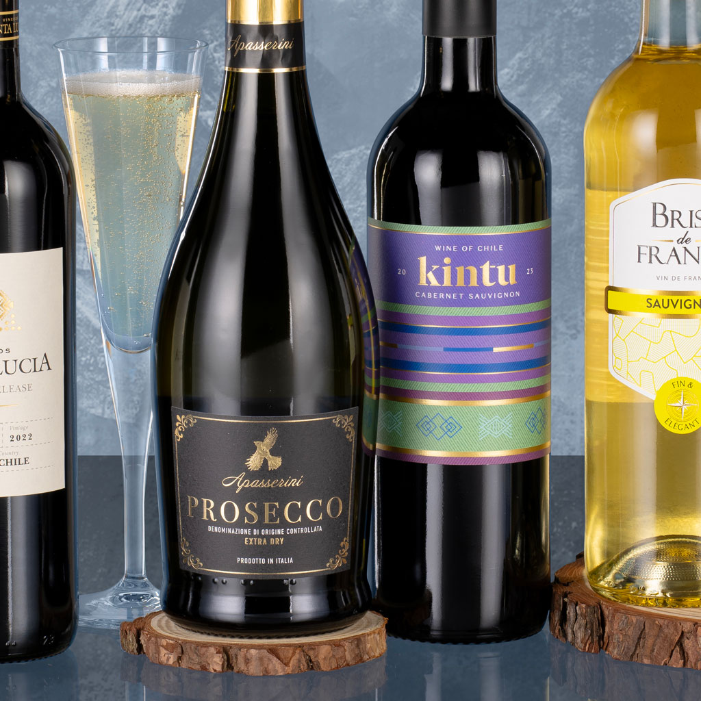 Raise a glass with the crisp and elegant Apasserini Prosecco, a festive favourite with lively bubbles and a refreshing finish. Enjoy the smooth and fruity notes of the Santa Lucia Merlot and the bold character of the Kintu Cabernet Sauvignon, two reds that pair beautifully with hearty winter fare. Discover the juicy depth of the Vina Elena Tempranillo, a Spanish red that adds a touch of rustic charm.