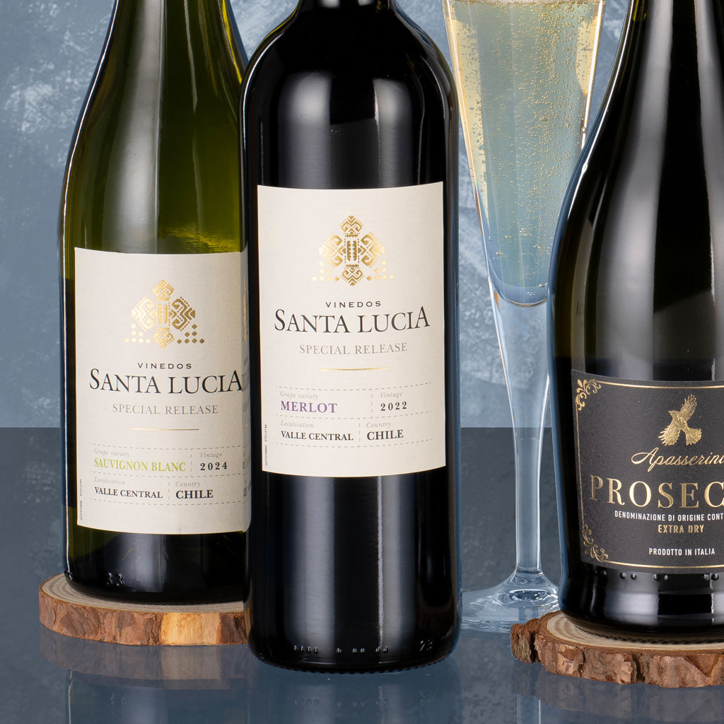 • Prosecco Apasserini Italy 75cl 10.5% vol â„® Sauvignon Brise de France 75cl 11.5% vol Cabernet Sauvignon Kintu Chile 75cl 12.5% vol Merlot Santa Lucia Central Valley Chile 75cl 13.5% vol Sauvignon Blanc Santa Lucia Central Valley Chile 75cl 12.5% vol Tempranillo Vina Elena Spain 75cl 11% vol â„® Decorative Carton