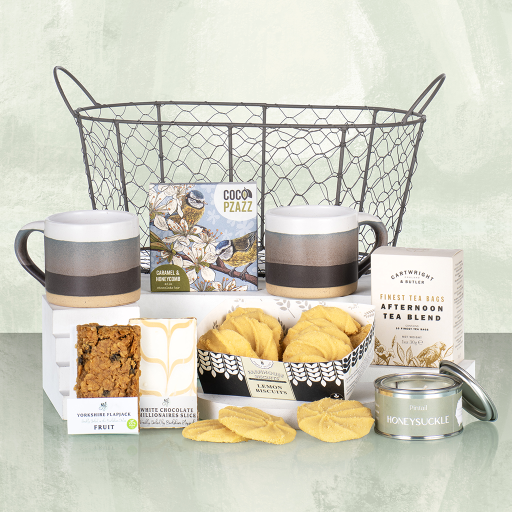 Fresh, floral and wonderfully comforting, our Tea in the Garden gift brings a touch of countryside calm to any afternoon. Beautifully presented in a reusable wire mesh storage basket, it’s a thoughtful collection of teatime treats and relaxing touches designed for quiet moments of pleasure. Brew a perfectly balanced pot of Cartwright & Butler English Afternoon Blend Tea, best enjoyed in the charming Sass & Belle Grey Marlowe Mugs. Pair each sip with Farmhouse Biscuits Lemon Biscuits for a zesty crunch or the duo of Yorkshire Flapjack Fruit Flapjack and White Chocolate Millionaire Slice for a buttery, indulgent bite. A Coco Pzazz Fox & Boo Caramel & Honeycomb Milk Chocolate Bar adds a luxurious finish, while the gentle glow of the Pintail Honeysuckle Candle fills the air with soft floral fragrance. Tea in the Garden captures the essence of peaceful indulgence — a beautifully balanced gift for anyone who deserves a moment to unwind, the Virginia Hayward way.
