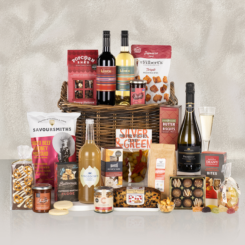 Grand, generous and beautifully curated, The Banquet is a celebration of fine food, drink and craftsmanship — a magnificent hamper designed to impress. Presented in a traditional oval Kubu woven basket, this sumptuous collection is filled with premium wines, artisan produce and indulgent delicacies for an unforgettable gifting experience. Three distinguished drinks set the tone: Montecampo Prosecco DOC brings lively sparkle, while Kintu Merlot and Kintu Sauvignon Blanc offer rich red and crisp white depth. Kingsdown Cloudy Lemonade and Source Climate Change Coffee Gishwati Cloud Forest Ground Coffee complete the collection with refreshing contrast. Savoury highlights include Dean’s Extra Mature Cheddar with Chilli Bites, Peter’s Yard Fig & Spelt Sourdough Crackers, Silver & Green Piri Piri Stuffed Olives, and Mr Filbert’s Teriyaki Mochi Rice Bites, alongside Cambrook Sweet Chilli Peanuts & Cashews and Savoursmiths Wagyu Beef Crisps. For those with a sweet tooth, there’s Bramble Foods Cherry & Walnut Slab Cake, Crunch & Crumble Shortbread, Buttermilk Espresso Martini Fudge, Linden Lady Chocolate Truffles, Ooh! Chocolata Fruity Jellies, Popcorn Shed Berry Popcorn and a Stas Chocolatier Milk Chocolate Bar with White Chocolate Drizzle & Pretzels. Finally, Highfield Preserves Strawberry Jam and Sweet Red Pepper Relish bring balance and freshness to this feast of flavour. Richly varied and exquisitely presented, The Banquet is the epitome of Virginia Hayward luxury — the perfect choice for grand celebrations or the ultimate corporate gesture.