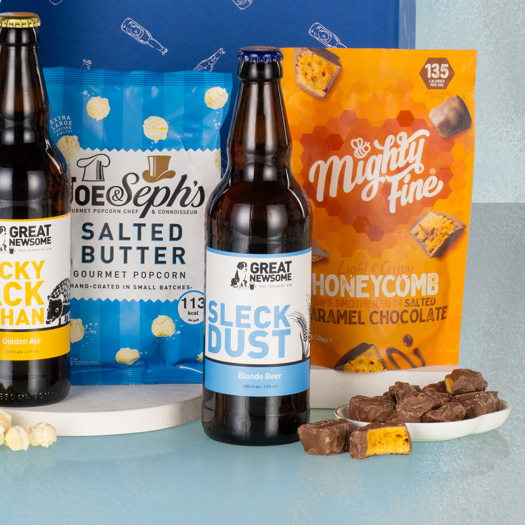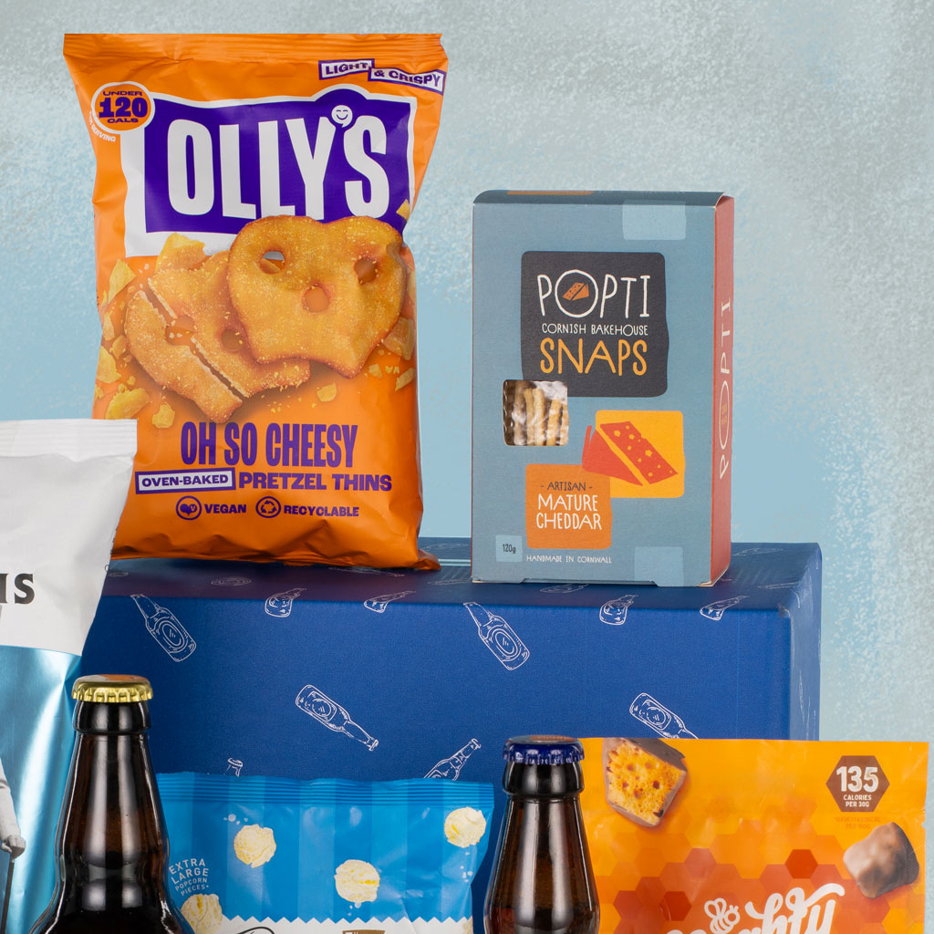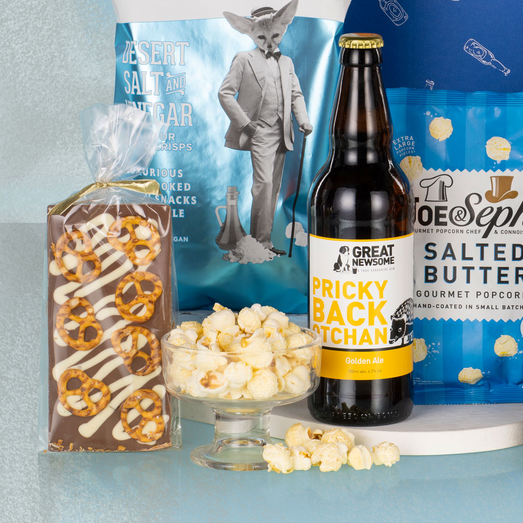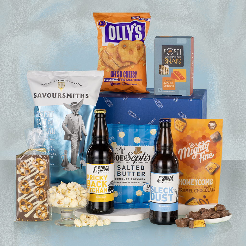 Relax, unwind and enjoy some well-deserved downtime with Boys Night In — the ultimate hamper for an evening of great taste and good company. Packed in a decorative postal carton, this laid-back yet luxurious collection brings together craft beer, savoury snacks and sweet indulgences for the perfect night off. Crack open bottles of Great Newsome Pricky Back Otchan and Great Newsome Sleck Dust Blonde Beer, two award-winning British brews that pair perfectly with Savoursmiths Desert Salt & Vinegar Crisps, Olly’s Oh So Cheesy Pretzel Thins and Popti Cornish Bakehouse Snaps Mature Cheddar. For something sweet, Mighty Fine Salted Caramel Honeycomb Dips and Joe & Seph’s Salted Butter Popcorn deliver crunchy caramel satisfaction, while Stas Chocolatier Milk Chocolate Bar with White Chocolate Drizzle & Pretzels ties it all together with a moreish mix of salty and sweet. Whether it’s a night in front of the TV, a well-earned treat or a thoughtful gift for him, Boys Night In is crafted for flavour, fun and a touch of indulgence — Virginia Hayward style.