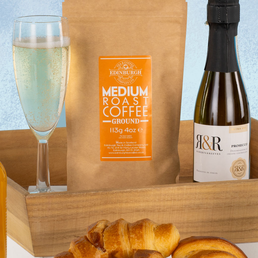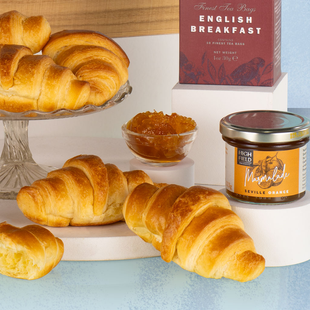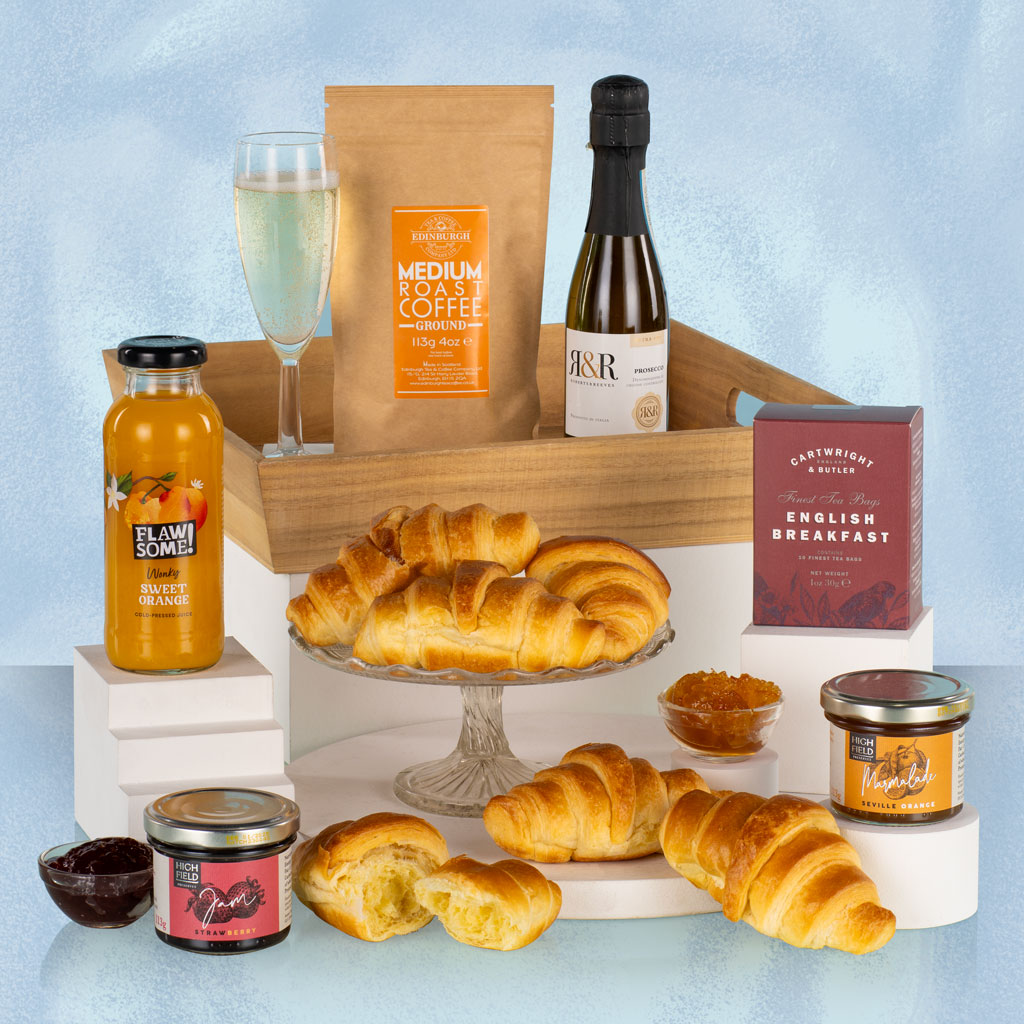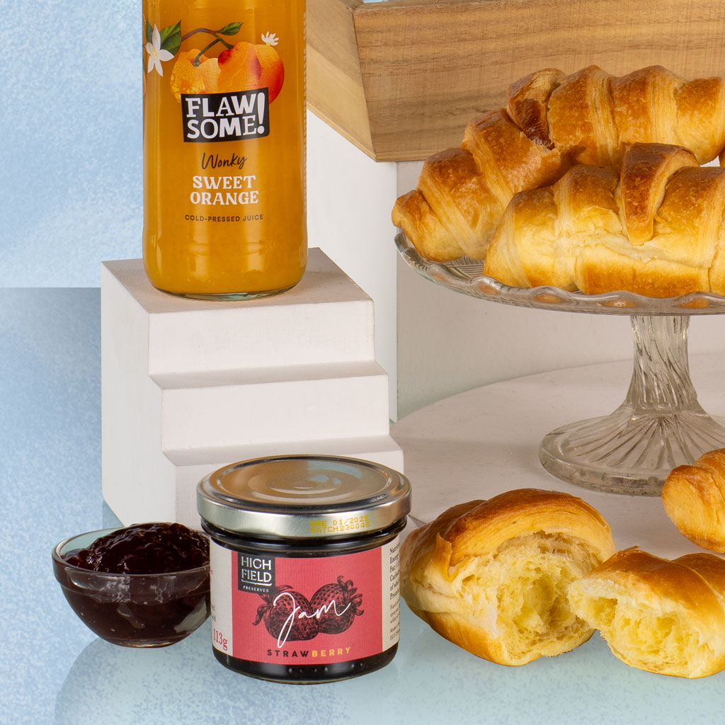 Elegant, uplifting and full of morning charm, our Breakfast Tray is the perfect way to start the day in style. Presented on a reusable wooden tray, this thoughtful collection combines freshly baked flavour with artisan preserves, fine beverages and a touch of sparkle — ideal for gifting or weekend indulgence. Begin the morning with light, buttery Les Brioches Croissants, perfectly paired with Highfield Preserves Strawberry Jam and Seville Orange Marmalade for a taste of classic breakfast luxury. Cartwright & Butler English Breakfast Tea and Edinburgh Tea & Coffee Company Medium Roast Ground Coffee offer the perfect hot drinks to complement the spread, while Flawsome! Sweet Orange Juice adds a refreshing citrus lift. To finish, a petite bottle of R&R Robert & Reeves Prosecco brings celebratory sparkle to the experience. Sophisticated yet comforting, the Breakfast Tray is a beautifully balanced gift that captures the pleasure of a slow morning — quintessential Virginia Hayward refinement from the very first sip.