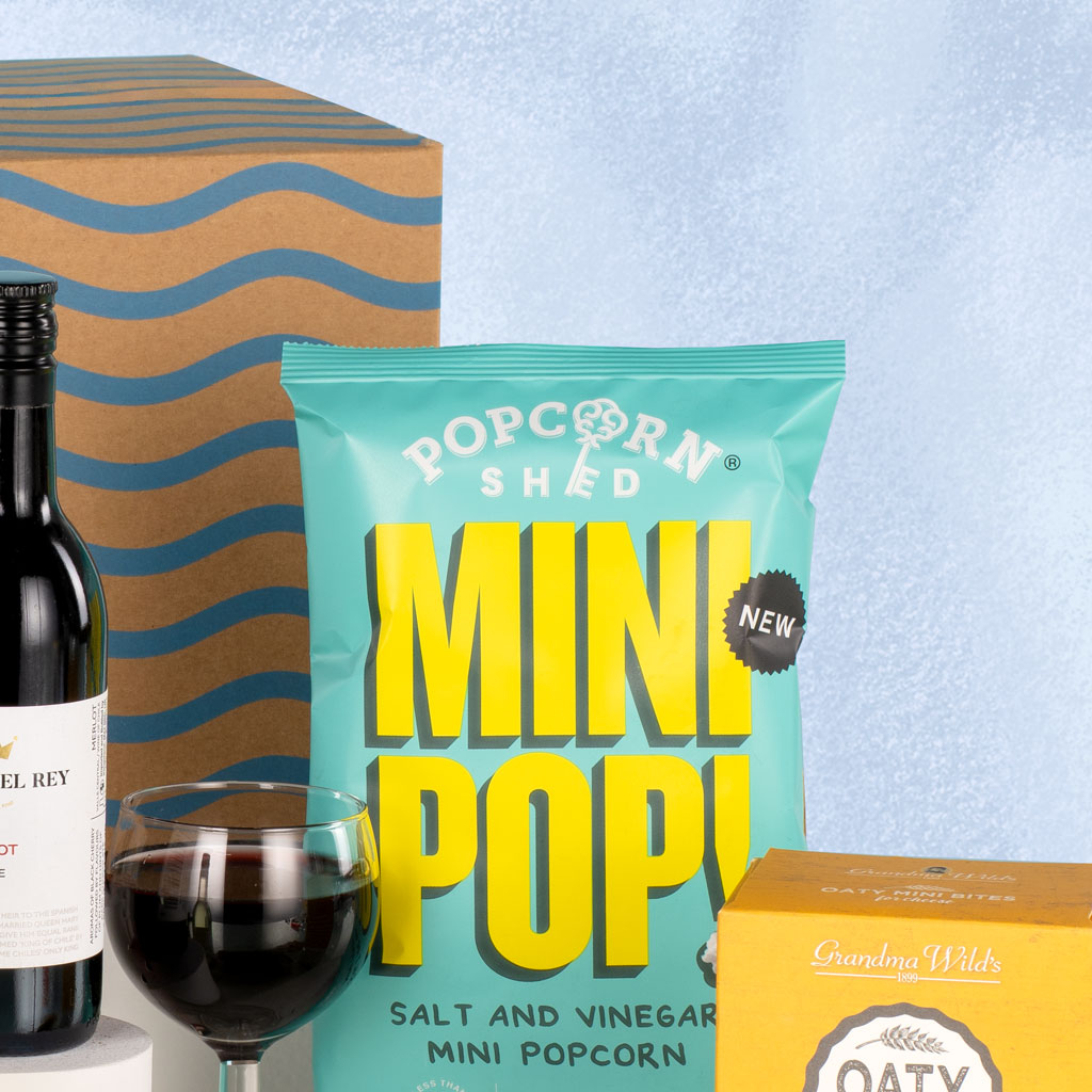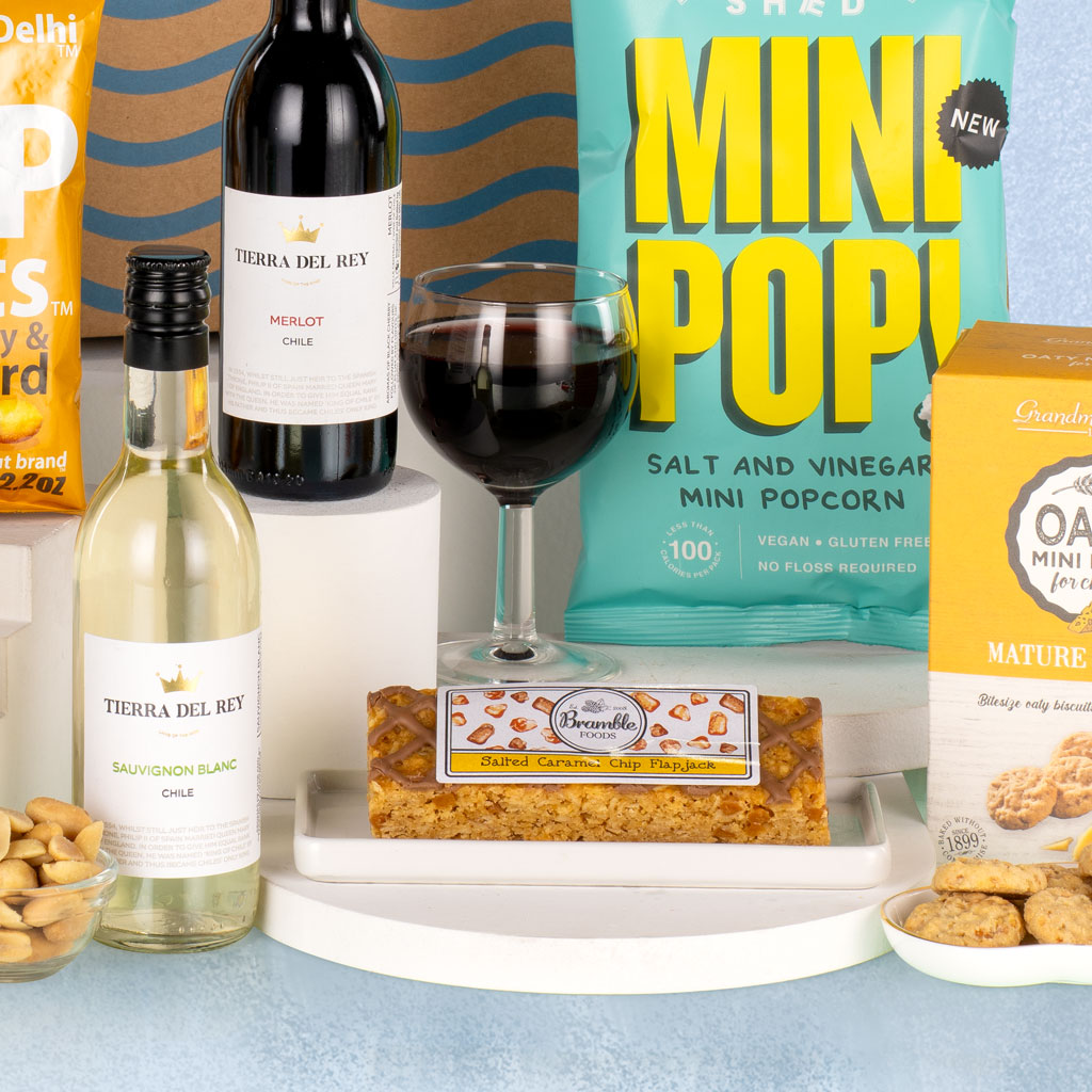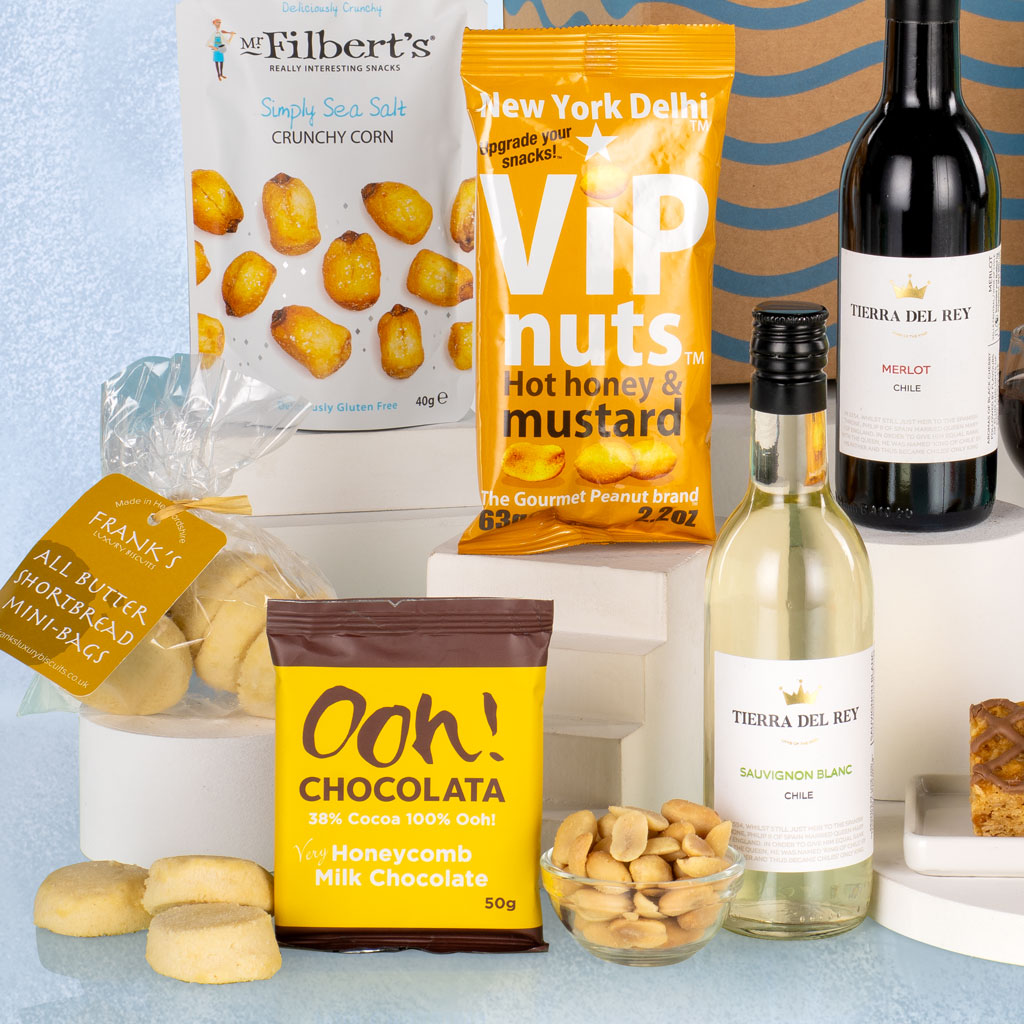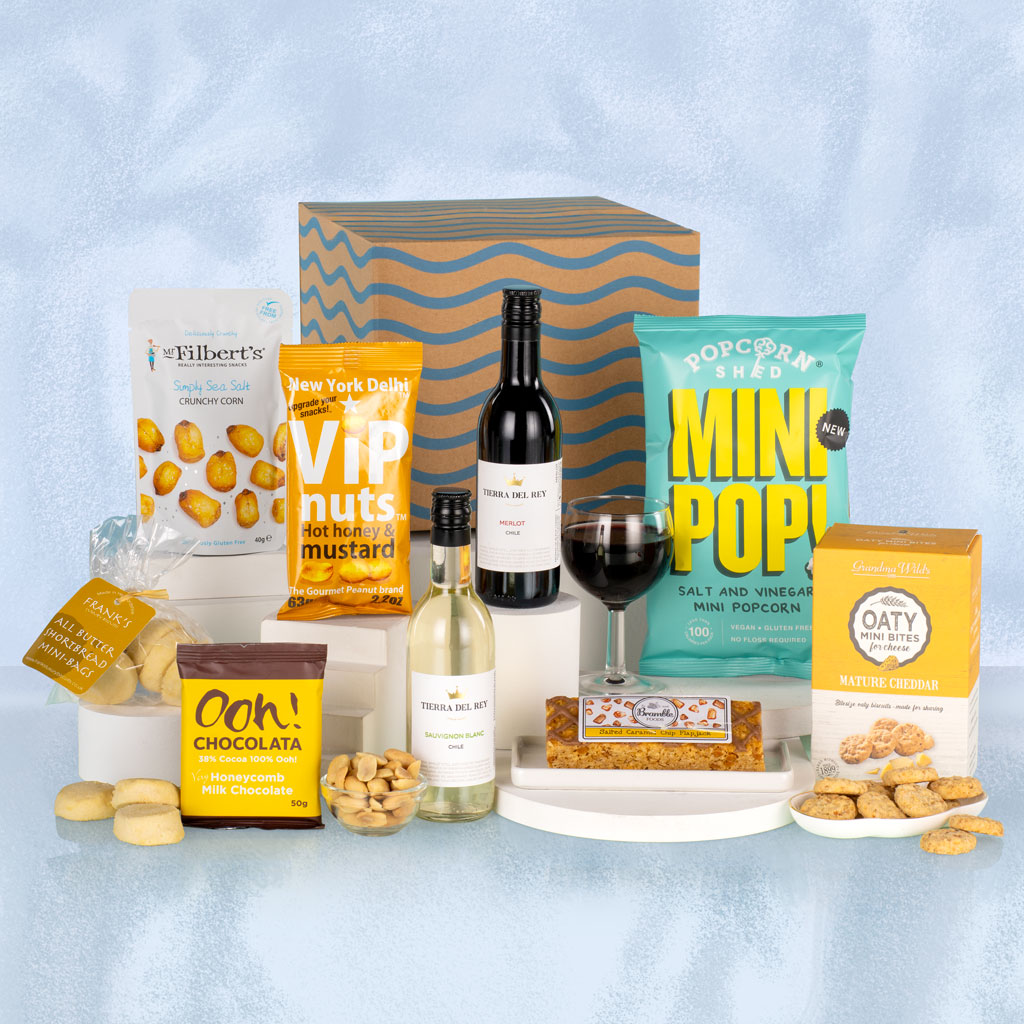 Packed with irresistible flavours and just the right touch of indulgence, our Desert Island hamper is the perfect treat for those who love a little bit of everything. Presented in a decorative postal carton, this compact yet generous collection combines sweet and savoury snacks with miniature bottles of wine for the ultimate relaxing escape — no island required. Enjoy Tierra Del Rey Merlot and Tierra Del Rey Sauvignon Blanc, two perfectly balanced single-serve wines from Chile that pair beautifully with the selection inside. Grandma Wild’s Mature Cheddar Mini Bites, Mr Filbert’s Crunchy Corn Simply Sea Salt and New York Delhi ViP Nuts Hot Honey & Mustard deliver satisfying savoury crunch, while Bramble Foods Salted Caramel Chip Flapjack and Frank’s Luxury Shortbread Mini Bites bring homely sweetness. Finishing touches come with Ooh! Chocolata Very Honeycomb Milk Chocolate Bar and Popcorn Shed Mini Pop! Salt & Vinegar — playful, punchy and perfectly portioned. Balanced, thoughtful and full of character, the Desert Island is a small hamper with big appeal — a delightful pick-me-up for any occasion.