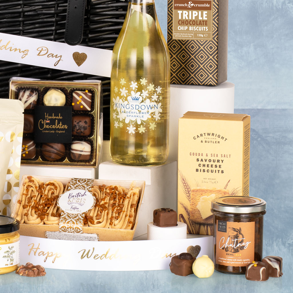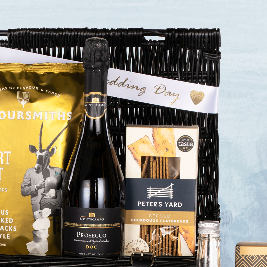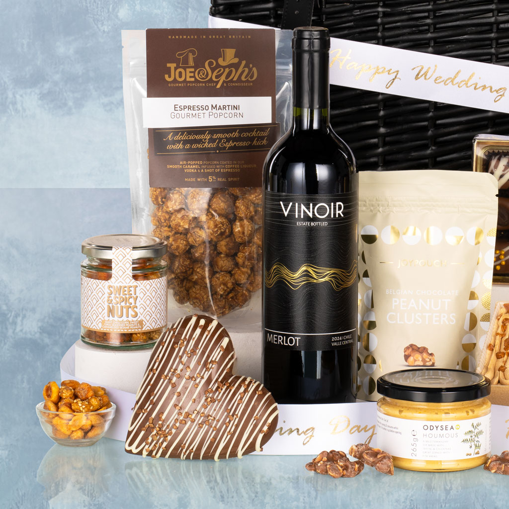 Celebrate love, commitment, and the joy of a lifetime together with the Traditional Wedding Hamper, a luxurious gift perfect for newlyweds. Carefully curated to mark this special occasion, it combines indulgent sweet and savoury treats with premium drinks, beautifully presented in a black wicker lidded basket and finished with a white satin wedding ribbon — making it a sophisticated and memorable wedding gift.