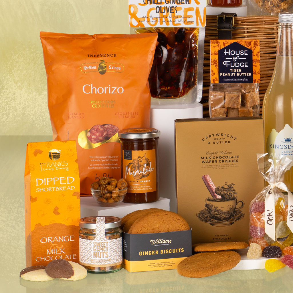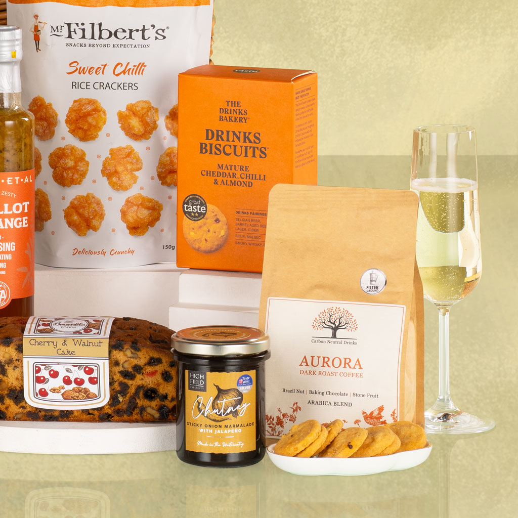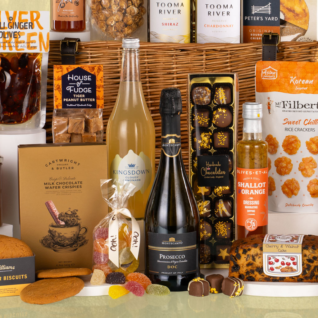 Grand, generous and unforgettable, The Ultimate is exactly that — the pinnacle of gourmet gifting. Presented in a traditional wicker basket, this showstopping hamper overflows with fine food, artisan confectionery and premium drinks, thoughtfully curated for those moments that deserve nothing less than the best. The collection features a trio of exceptional wines — Montecampo Prosecco DOC, Tooma River Reserve Shiraz and Tooma River Reserve Chardonnay — alongside Kingsdown Cloudy Lemonade and Aurora Dark Roast Ground Coffee from The Carbon Neutral Drinks Co., ensuring refreshment for every taste. The savoury selection is abundant and refined: Mr Filbert’s Sweet Chilli Rice Crackers, Cambrook Sweet & Spicy Nut Mix, Silver & Green Chilli & Ginger Olives, Peter’s Yard Crispbreads, The Drinks Biscuits Mature Cheddar with Chilli & Almond, Inessence Chorizo Crisps, and Olives Et Al Shallot & Orange Dressing bring depth and contrast to every bite. For those with a sweet tooth, there’s Bramble Foods Cherry & Walnut Slab Cake, Frank’s Luxury Orange & Milk Chocolate Dipped Shortbread, Mighty Fine Salted Caramel Honeycomb Dips, Cartwright & Butler Milk Chocolate Wafer Crispies, Williams Handbaked Ginger Biscuits, House of Fudge Tiger Peanut Butter Fudge, Joe & Seph’s Caramel Macchiato Popcorn with Scotch Whisky, Ooh! Chocolata Fruity Jellies and Linden Lady 16 Milk Chocolates. Completing the feast are Highfield Preserves Apricot Jam, Seville Orange Marmalade and Sticky Onion Marmalade with Jalapeño — a trio of perfectly balanced accompaniments. Luxurious, layered and unforgettable, The Ultimate is more than a hamper — it’s an experience. Designed to impress, to indulge and to remember.