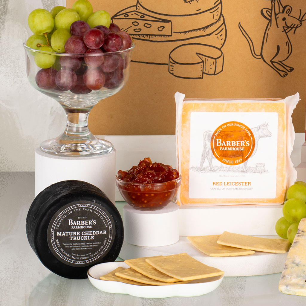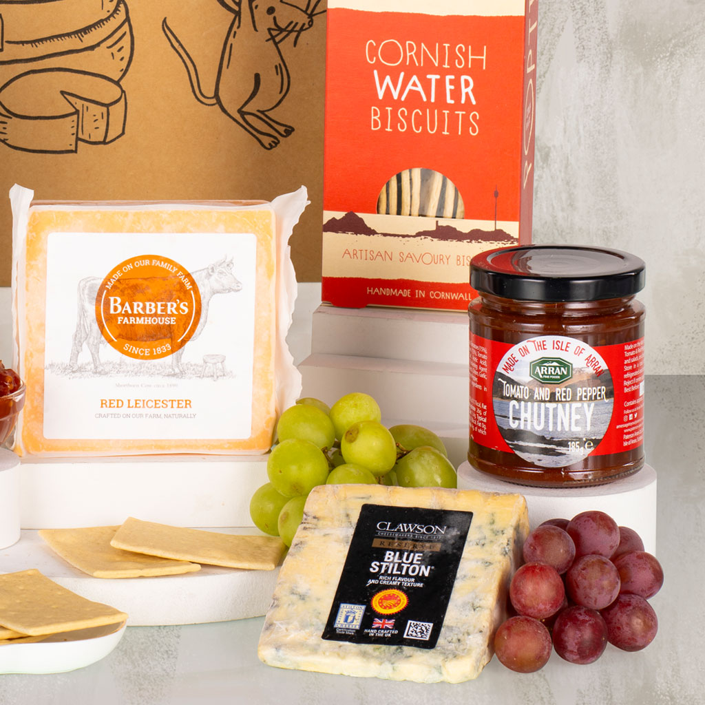 Inside, enjoy a carefully curated selection including a Barber’s Farmhouse Mature Cheddar Truckle, Barbers Farmhouse Red Leicester Prepack, and a creamy Long Clawson Blue Stilton Wedge. Each cheese is perfectly complemented by the sweet and tangy Arran Fine Foods Tomato & Red Pepper Chutney and crisp Popti Cornish Bakehouse Cornish Water Biscuits, creating an elegant and indulgent tasting experience. Perfect for two, this Valentine’s cheese hamper is a sophisticated way to celebrate love, enjoy a quiet night in, and toast to romance with every delicious bite.