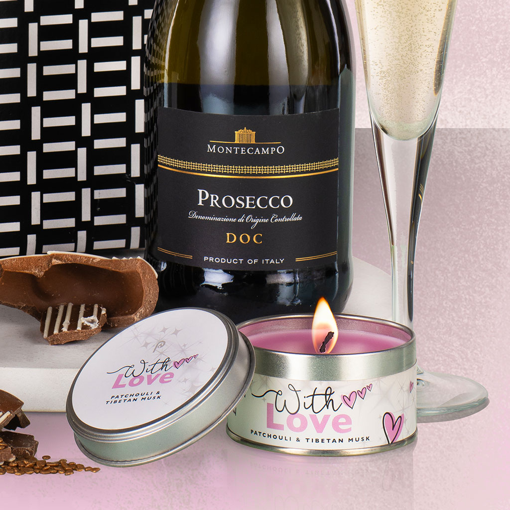 Completing the gift is a Pintail hand-poured ‘For Love’ candle in a contemporary tin, adding a warm, understated glow. Thoughtfully curated and beautifully balanced, this Valentine’s Prosecco gift makes a romantic gift for Valentine’s Day, anniversaries, or weddings, with added sparkle and sweetness.