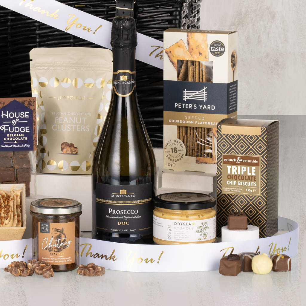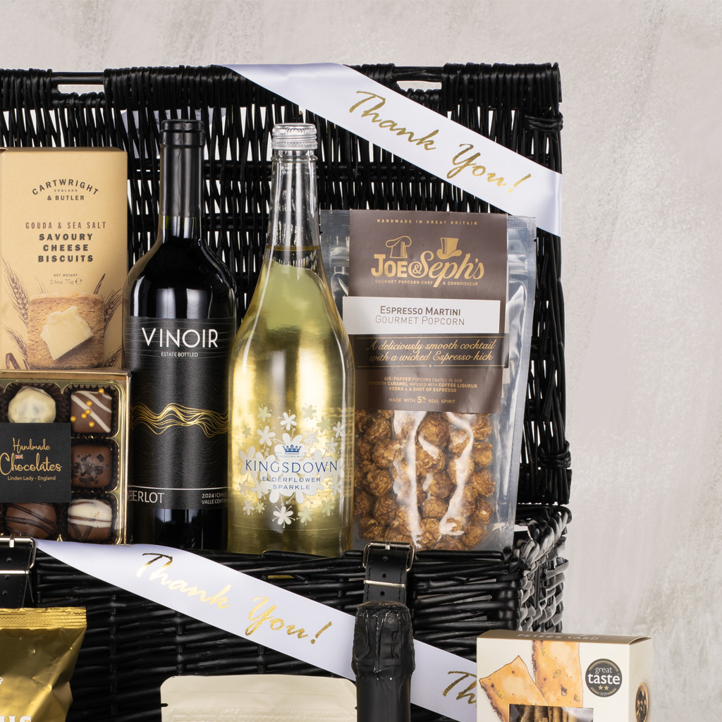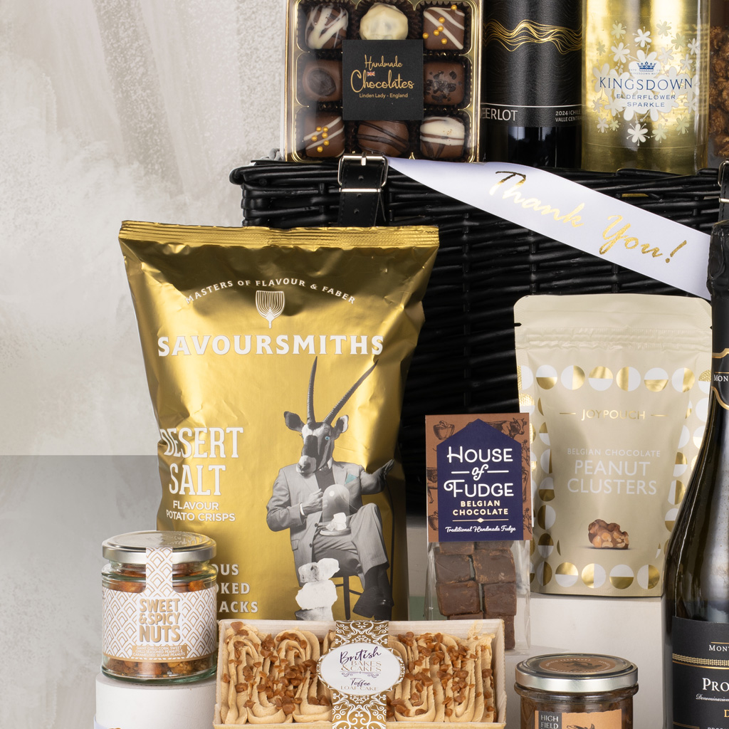 This versatile thank you gift basket combines gourmet flavours, elegant presentation, and luxurious indulgence – perfect for expressing heartfelt appreciation in style.
